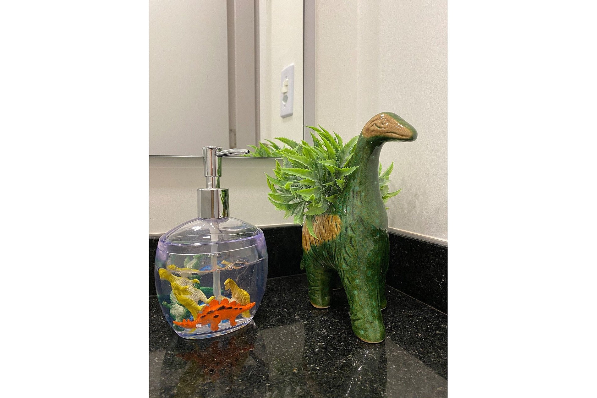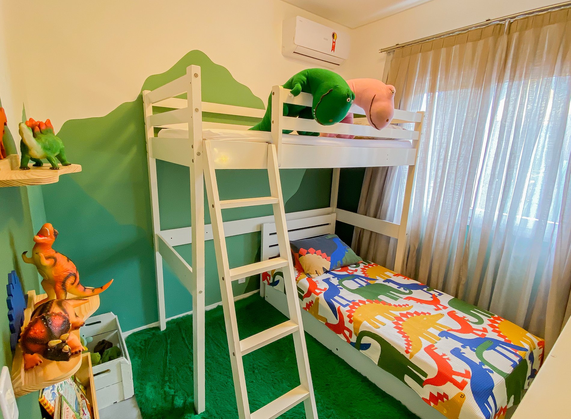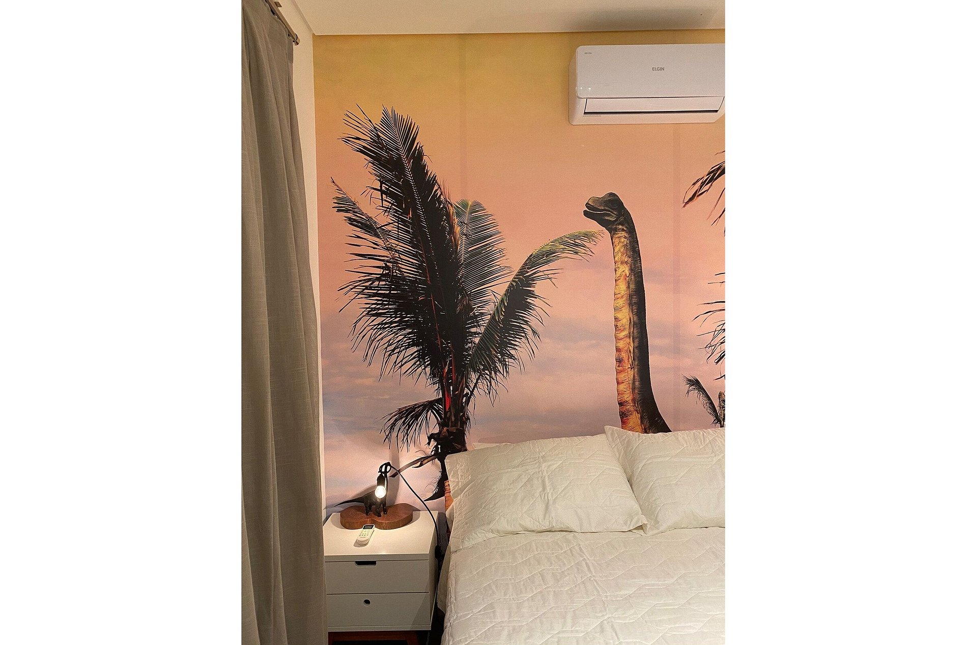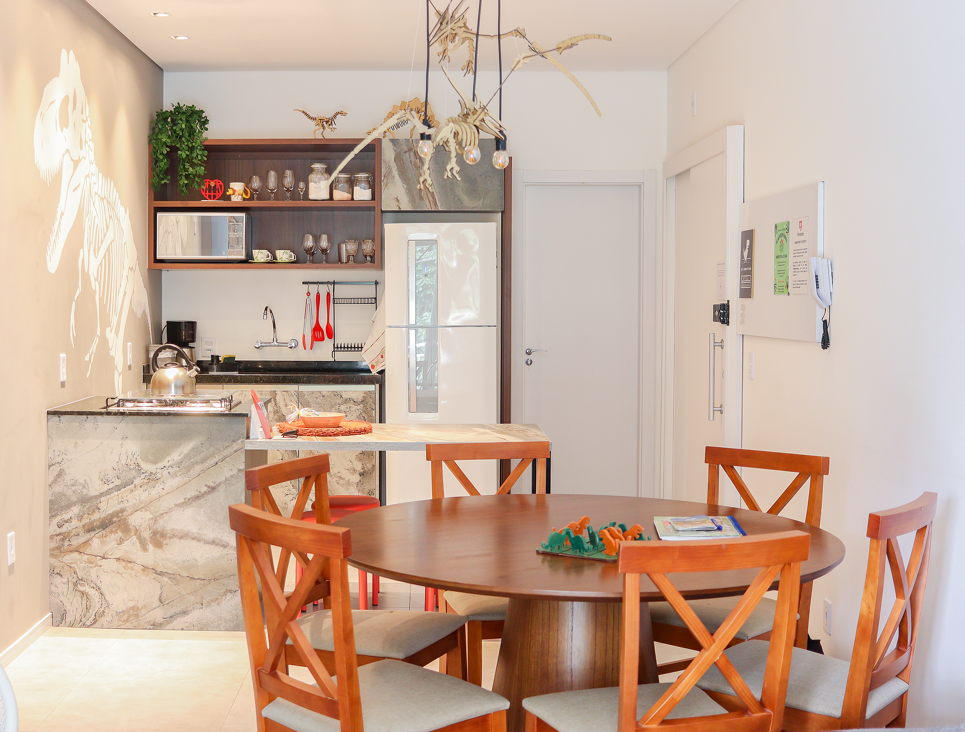 O apartamento é finamente mobiliado, com muito conforto, roupas de cama, toalhas, louças e utensílios de cozinha. Decorado na temática que encanta crianças e adultos, o mundo dos Dinossauros.