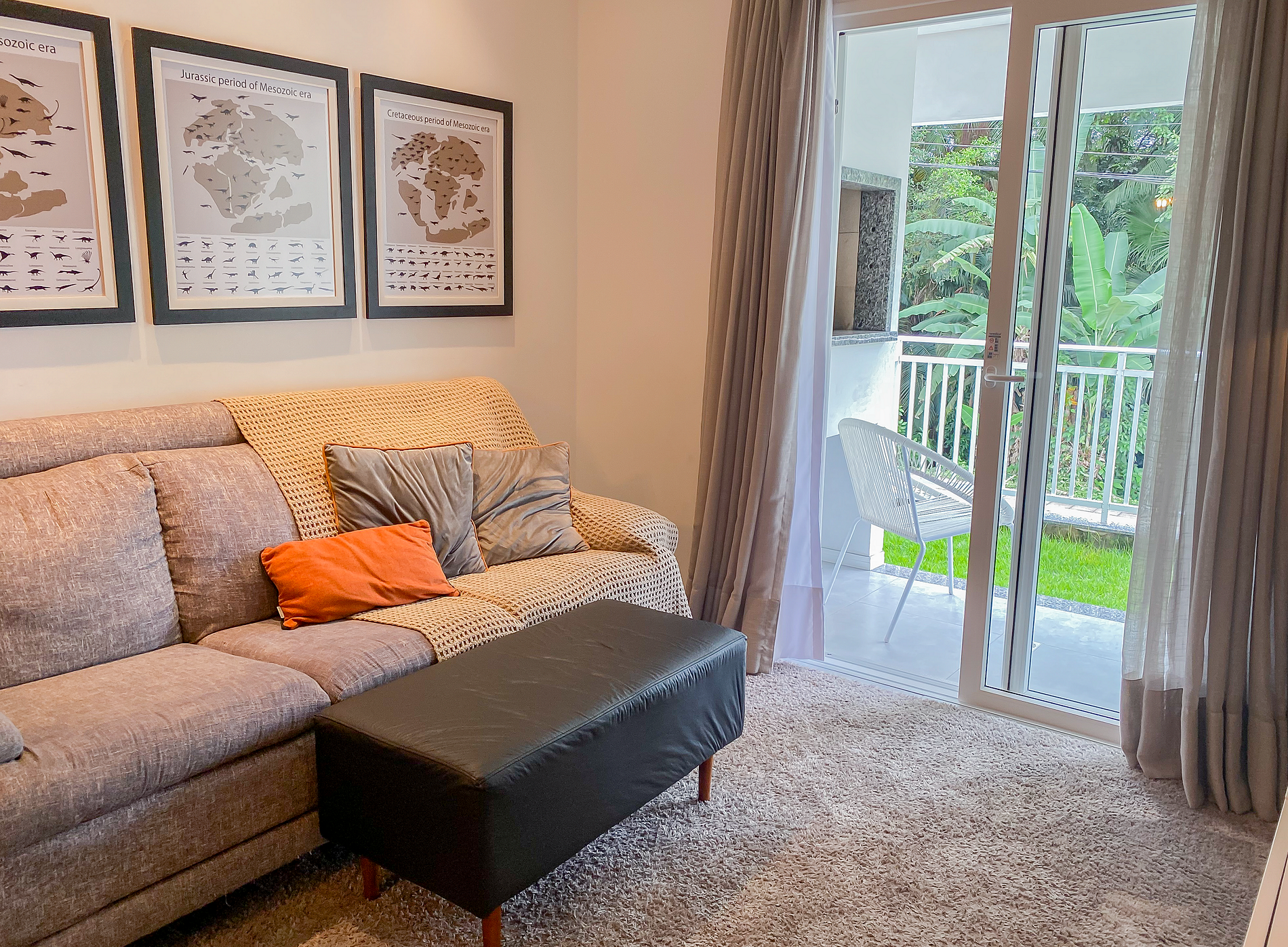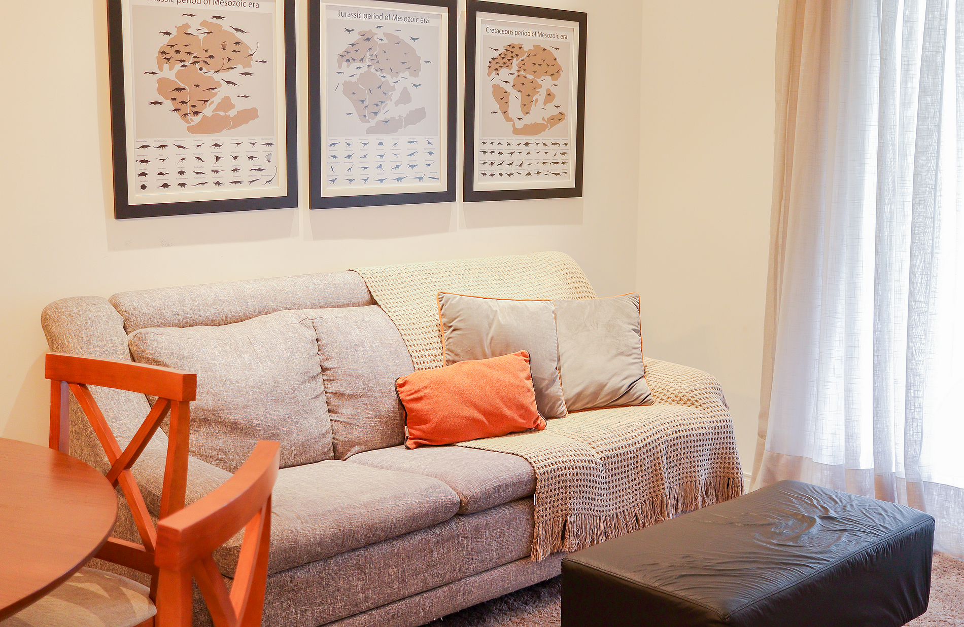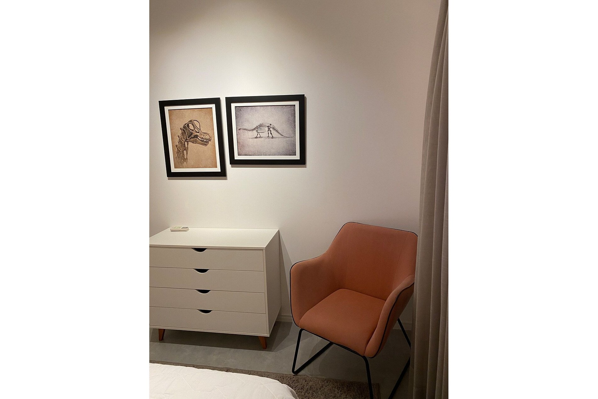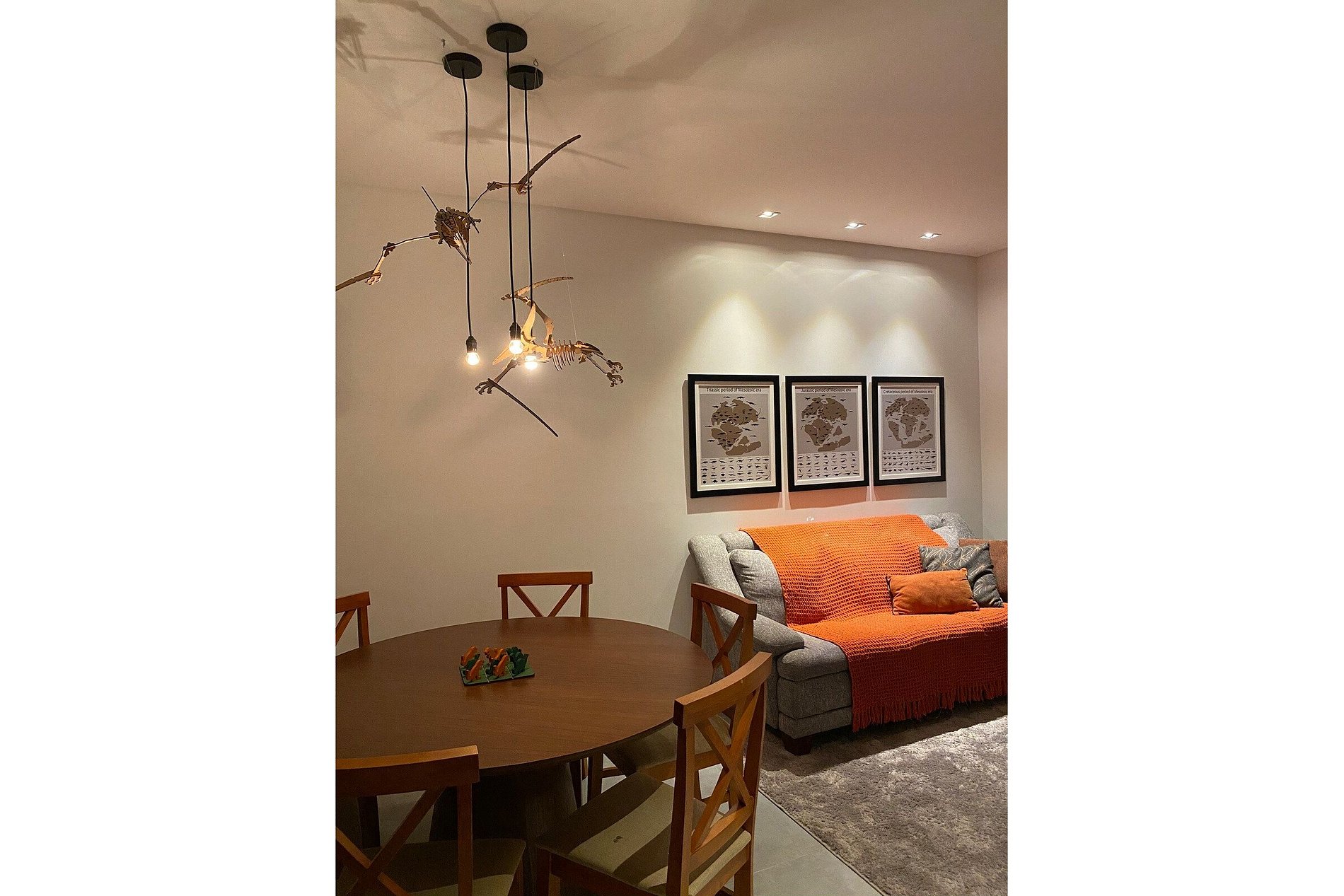 O apartamento é finamente mobiliado, com muito conforto, roupas de cama, toalhas, louças e utensílios de cozinha. Decorado na temática que encanta crianças e adultos, o mundo dos Dinossauros.